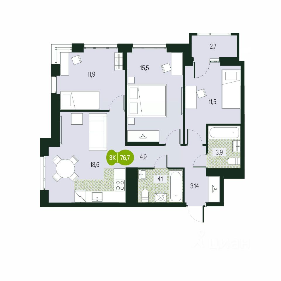 76 м² · Этаж 15 из 18