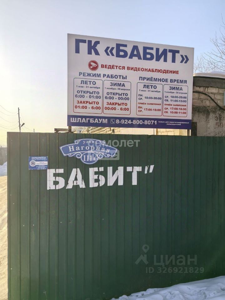 Арт. 129995084 Продается гараж в ГК ''Бабит''. По гаражному кооперативу: Гаражный кооператив находится по улице Нагорная 111А, Отличное расположение бокса, находится под постоянным и прямым наблюдением сторожа, Ведется видеонаблюдение и заезд только через шлагбаум. По гаражу: Гараж с погребом, По всему гаражу проведен свет. По документам: Один взрослый собственник, Долги, запреты отсутствуют, Полная цена в договоре.