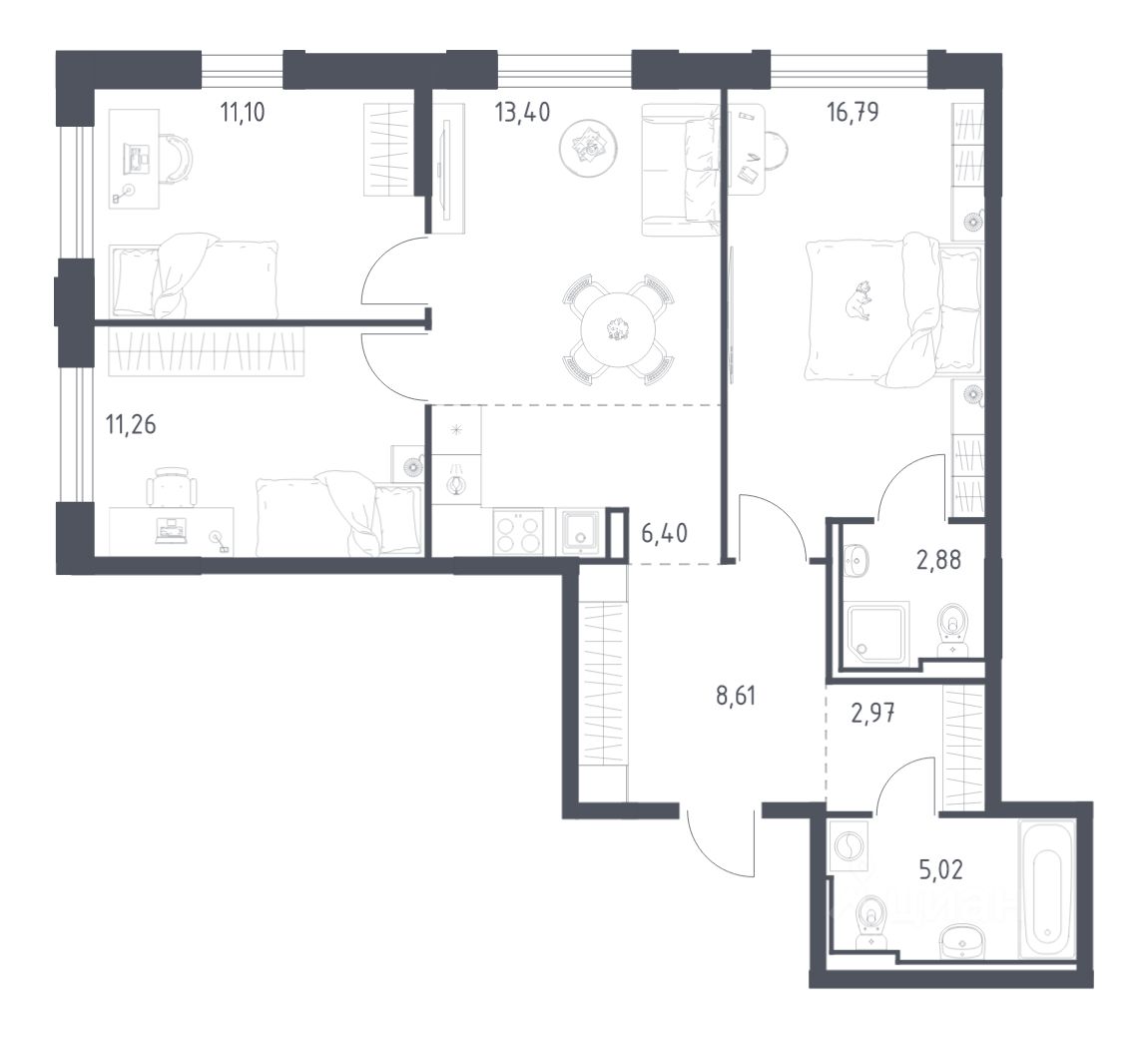 Строим кварталы для жизни с заботой о будущем. Предлагается 3-комнатная квартира комфорт-класса площадью 68.79 кв.м в корпусе 1.2КВ на 15-м этаже, в жилом комплексе ''Рябиновая Роща''. Квартиры без отделки. Доступность опции ''отделка'' и возможность комплектации мебелью и декором уточняйте у застройщика. Выбирайте свое место для счастливой жизни: от уютной студии до просторной 3-комнатной квартиры. Хотите погрузиться в творческий процесс ремонта? Присмотритесь к вариантам предчистовой отделки. Если хотите сразу отпраздновать новоселье, поручите нам работы по отделке. Мы установим двери, окна и сантехнику, положим ламинат и плитку. На стенах будут обои, которые можно перекрашивать до 8 раз. По вашему желанию мы подготовим в вашей квартире все для комфортной жизни. Откройте дверь своим ключом и пройдитесь по комнатам. Там уже будет мебель, светильники и другие элементы декора. А на кухне бежевых оттенков есть все, чтобы сразу приготовить вкусный ужин для близких. Приобрести квартиры возможно по специальным акциям от застройщика, с текущими условиями акций можно ознакомиться в блоке ''Акций''. Цена динамическая и может отличаться, уточняйте актуальность у застройщика. В ''Рябиновой Роще'' жители смогут наслаждаться прогулками по благоустроенной набережной и собственной рябиновой роще. До центра Читы — всего 13 минут на машине. В квартале будет 2 детских сада на 300 и 305 мест и школа на 1 100 мест. На первых этажах откроются магазины, кафе и салоны красоты. Совсем рядом появится благоустроенная набережная длиной 14 км для прогулок и утренних пробежек. ''Рябиновая Роща'' — это комплекс с домами высотой от 9 до 17 этажей в монохромных оттенках с красными акцентами. Дворы проекта вдохновлены Даурским заповедником. Жители смогут заниматься спортом на свежем воздухе, собираться на праздники на общей площади или читать в рябиновой роще. Для детей — современные игровые площадки. Для автомобилистов предусмотрены 4 многоуровневых паркинга. Входы в лобби находятся на уровне земли, внутри есть места для хранения колясок и велосипедов. Квартиры с увеличенными окнами и видом на реку, гардеробными, кухнями-гостиными и гостевыми санузлами.