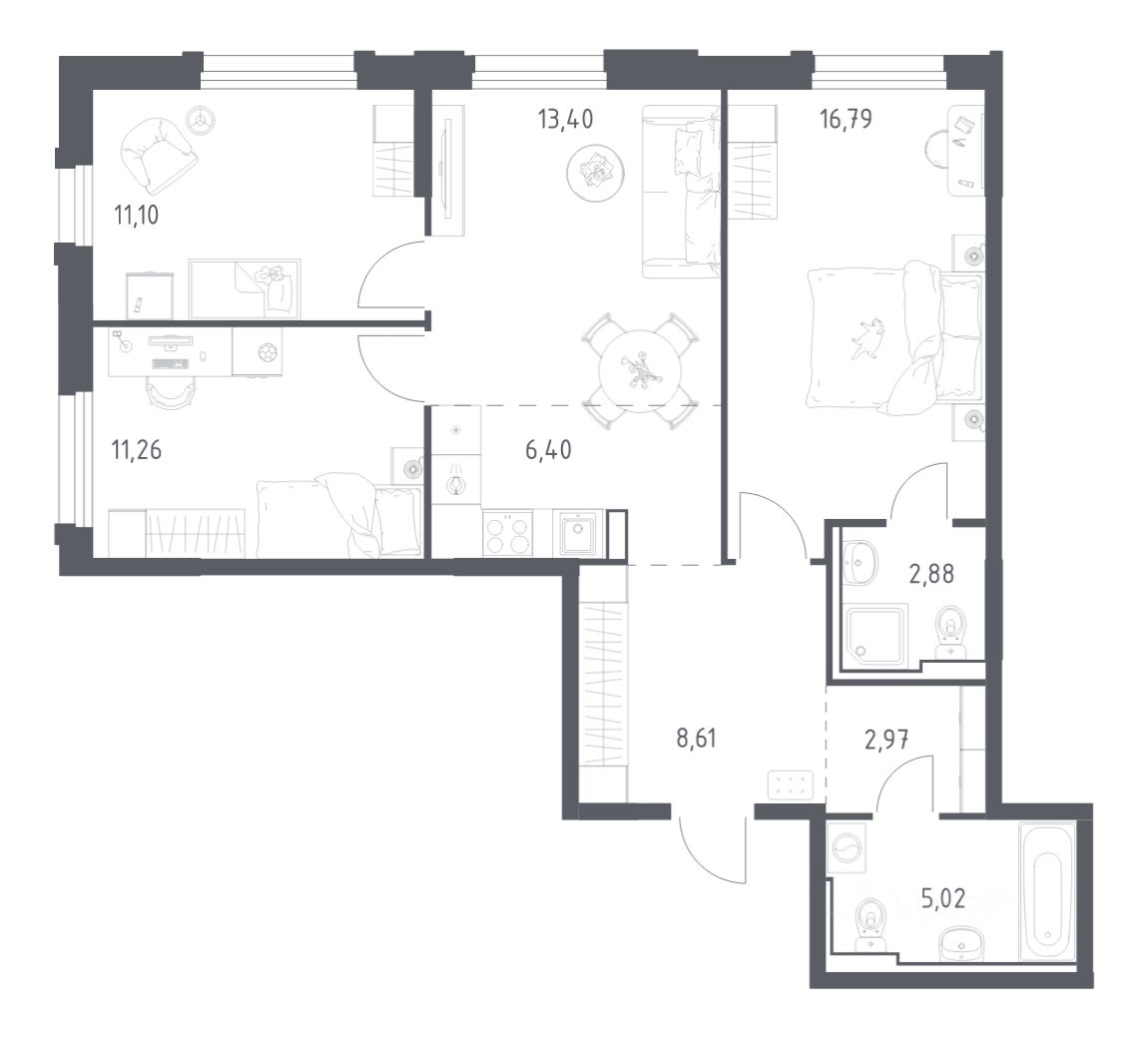 Строим кварталы для жизни с заботой о будущем. Предлагается 3-комнатная квартира комфорт-класса площадью 79.08 кв.м в корпусе 2.4КВ на 16-м этаже, в жилом комплексе ''Рябиновая Роща''. Квартиры без отделки. Доступность опции ''отделка'' и возможность комплектации мебелью и декором уточняйте у застройщика. Выбирайте свое место для счастливой жизни: от уютной студии до просторной 3-комнатной квартиры. Хотите погрузиться в творческий процесс ремонта? Присмотритесь к вариантам предчистовой отделки. Если хотите сразу отпраздновать новоселье, поручите нам работы по отделке. Мы установим двери, окна и сантехнику, положим ламинат и плитку. На стенах будут обои, которые можно перекрашивать до 8 раз. По вашему желанию мы подготовим в вашей квартире все для комфортной жизни. Откройте дверь своим ключом и пройдитесь по комнатам. Там уже будет мебель, светильники и другие элементы декора. А на кухне бежевых оттенков есть все, чтобы сразу приготовить вкусный ужин для близких. Приобрести квартиры возможно по специальным акциям от застройщика, с текущими условиями акций можно ознакомиться в блоке ''Акций''. Цена динамическая и может отличаться, уточняйте актуальность у застройщика. В ''Рябиновой Роще'' жители смогут наслаждаться прогулками по благоустроенной набережной и собственной рябиновой роще. До центра Читы — всего 13 минут на машине. В квартале будет 2 детских сада на 300 и 305 мест и школа на 1 100 мест. На первых этажах откроются магазины, кафе и салоны красоты. Совсем рядом появится благоустроенная набережная длиной 14 км для прогулок и утренних пробежек. ''Рябиновая Роща'' — это комплекс с домами высотой от 9 до 17 этажей в монохромных оттенках с красными акцентами. Дворы проекта вдохновлены Даурским заповедником. Жители смогут заниматься спортом на свежем воздухе, собираться на праздники на общей площади или читать в рябиновой роще. Для детей — современные игровые площадки. Для автомобилистов предусмотрены 4 многоуровневых паркинга. Входы в лобби находятся на уровне земли, внутри есть места для хранения колясок и велосипедов. Квартиры с увеличенными окнами и видом на реку, гардеробными, кухнями-гостиными и гостевыми санузлами.