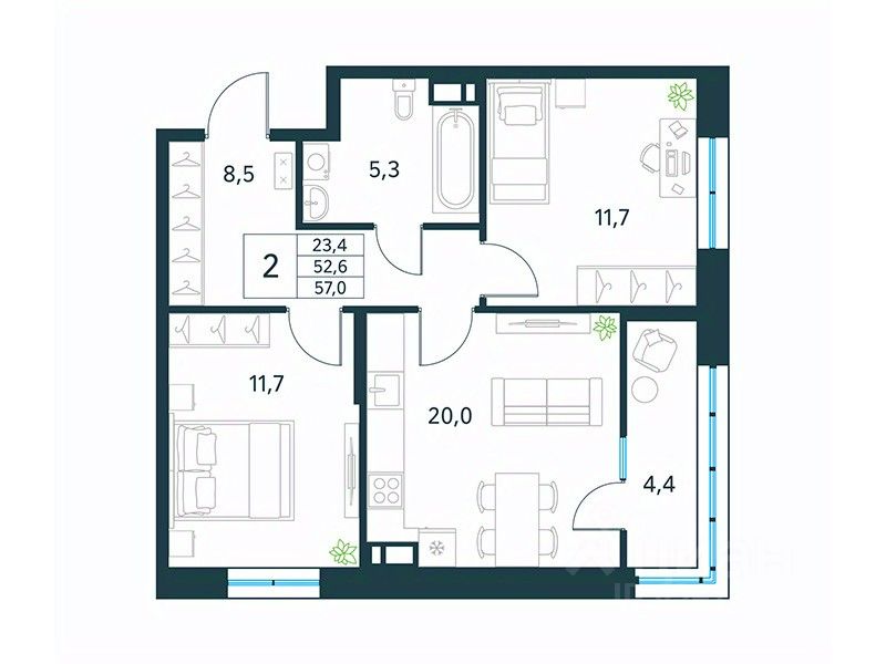 Продается 2-комн. квартира площадью 57 кв.м, без отделки. Квартира расположена на 16 этаже 18 этажного монолитного дома (Литер 1 (3 очередь), Секция 1) в ЖК ''Хороший'' от АТОЛЛ.