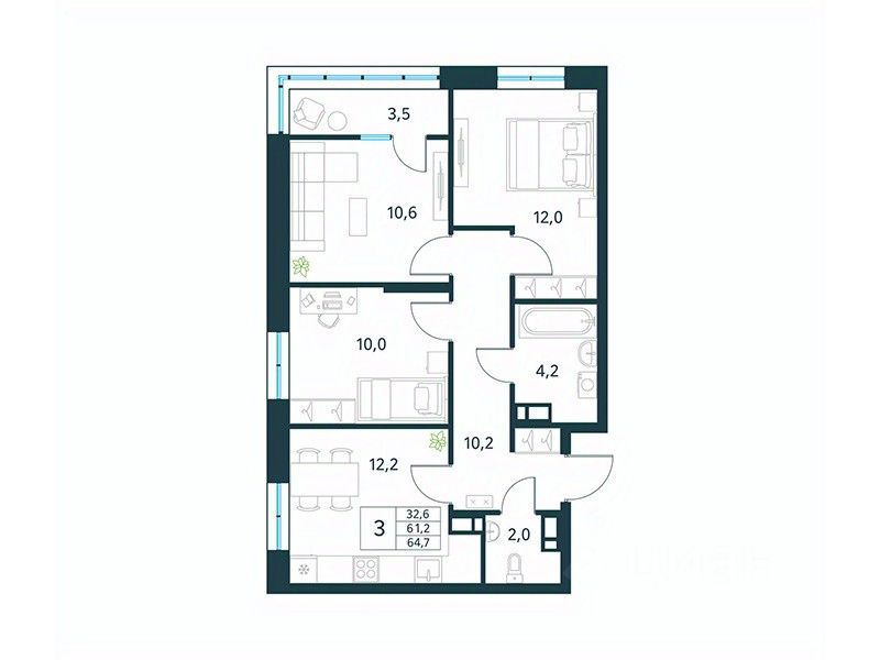 Продается 3-комн. квартира площадью 64,7 кв.м, без отделки. Квартира расположена на 16 этаже 18 этажного монолитного дома (Литер 1 (3 очередь), Секция 1) в ЖК ''Хороший'' от АТОЛЛ.