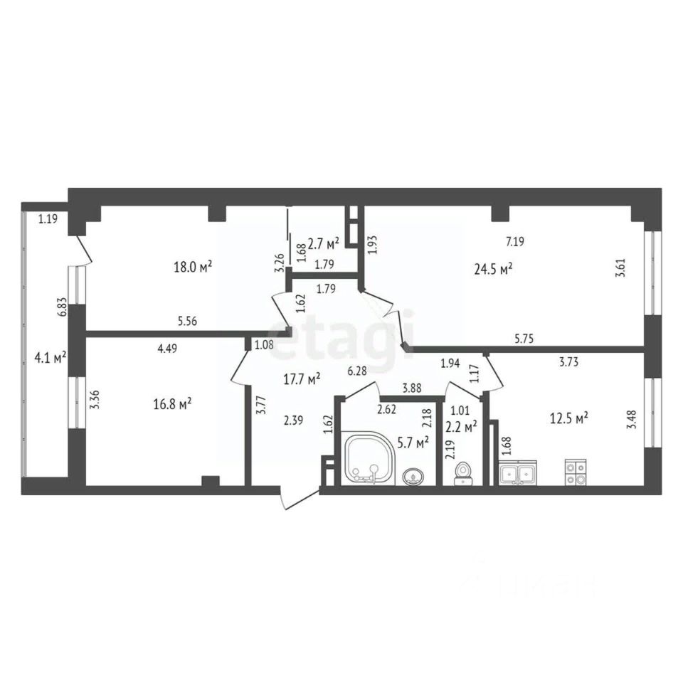 Общая площадь квартиры 100,1 кв.м., кухня 12,5 кв.м. Дом 2014 года постройки.