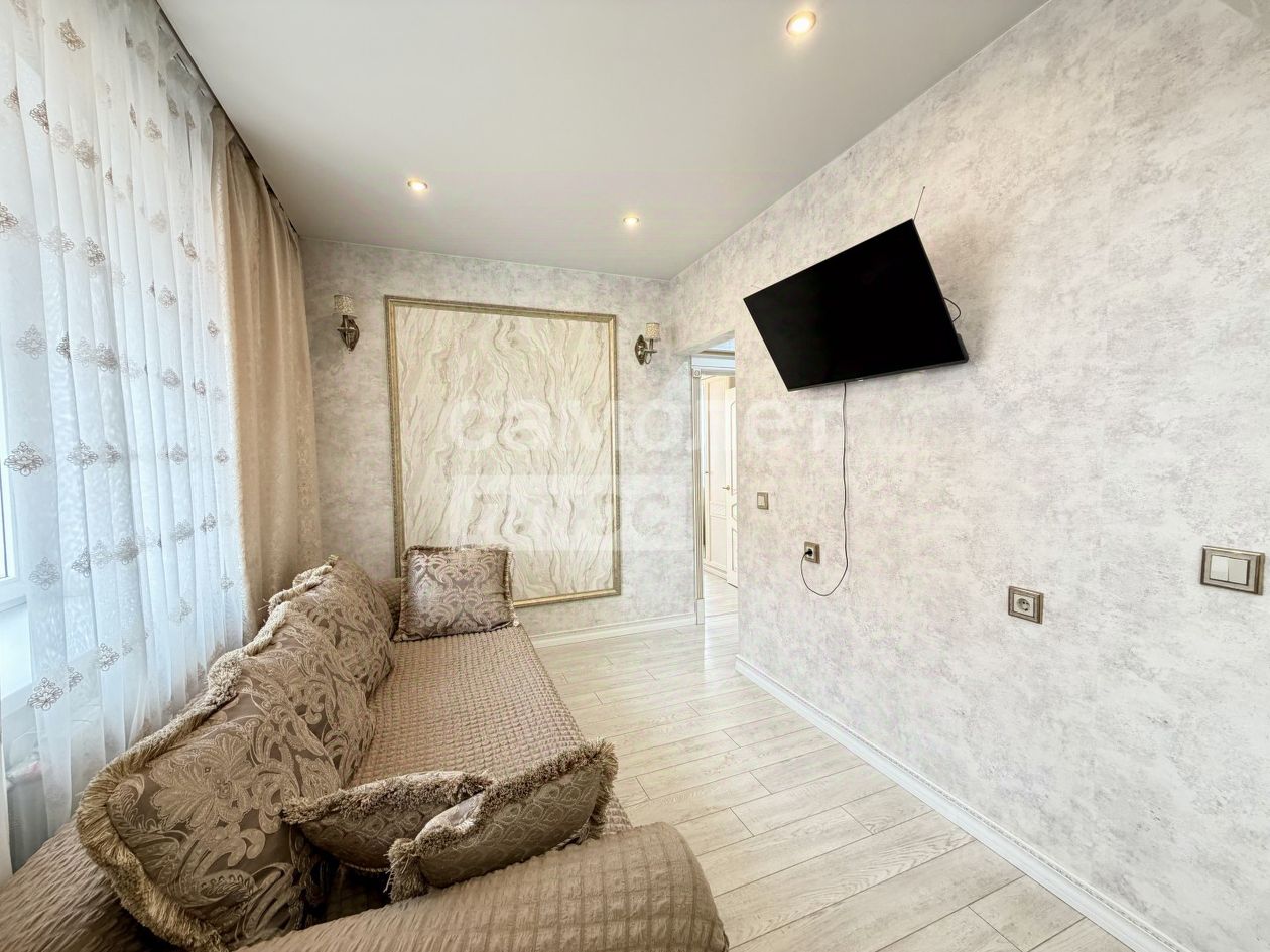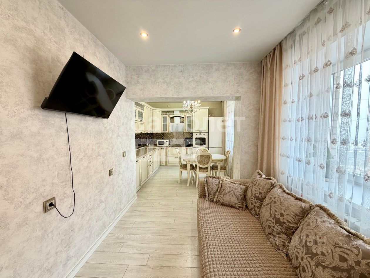 О Квартире: Идеальный вариант для большой семьи! Отличная планировка, все комнаты изолированы! В кухне-гостиной 19,5 м2 вы будете принимать гостей, а детки будут спокойно спать! Квартира солнечная, просторная, светлая. Окна выходят на обе стороны! В квартире сделан хороший и качественный ремонт, все выполнено в мягкой цветовой гамме, двери и арки из дерева инкрустированы золотом, натяжные потолки, пластиковые окна, 2 раздельных санузла облицованы кафелем, с новой сантехникой. Подъезд очень чистый, соседи все тихие, порядочные! Дополнительные блага-кондиционер и водонагреватель. ВСЯ МЕБЕЛЬ И ТЕХНИКА ОСТАЕТСЯ В КВАРТИРЕ, ЗАЕЗЖАЙ И ЖИВИ!