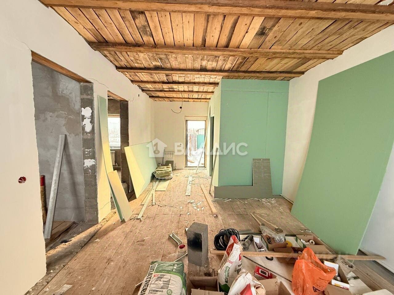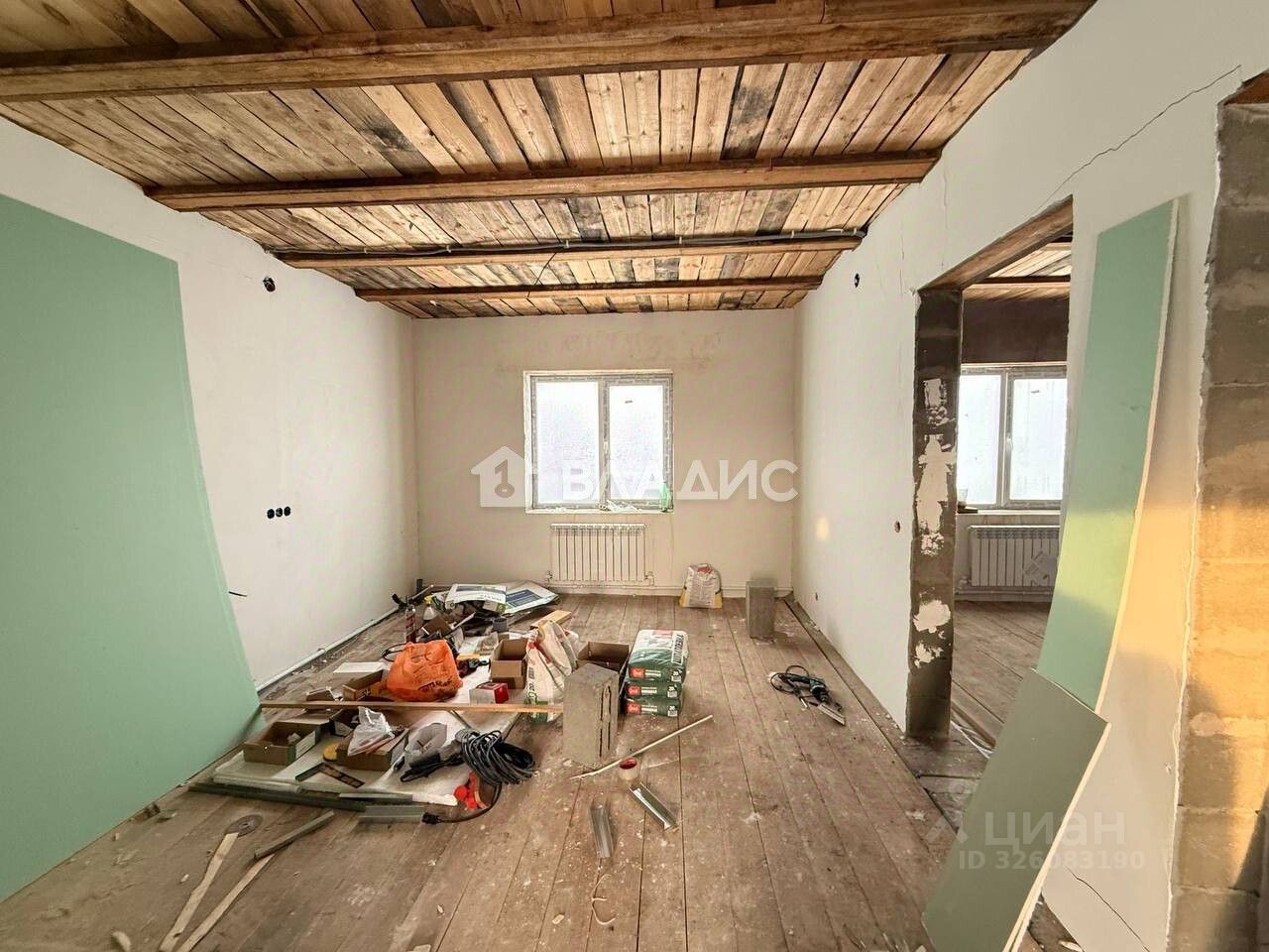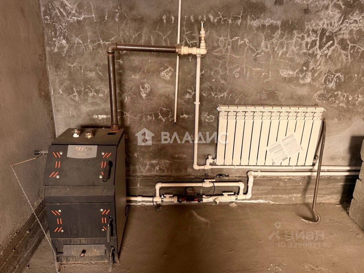 Окна, входная дверь установлены. Котел твердотопливный.