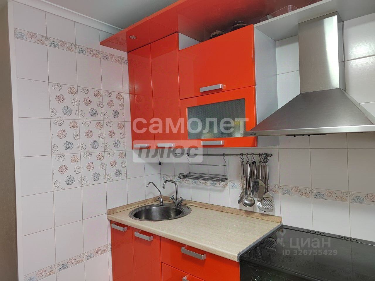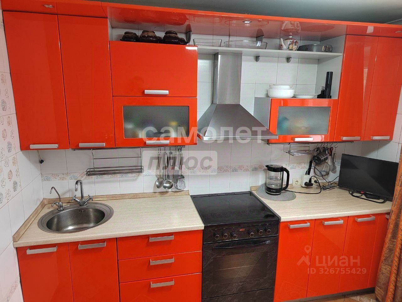 *Просторная кухня с кухонным гарнитуром и встроенной техникой,